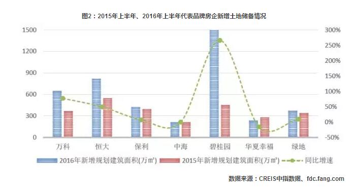 图2:2015年上半年、2016年上半年代表品牌房企新增土地储备情况