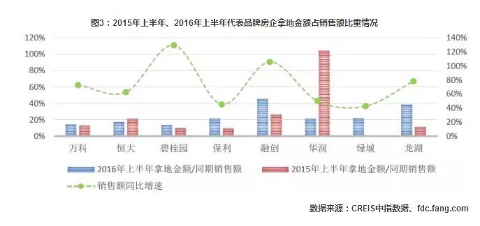 图3:2015年上半年、2016年上半年代表品牌房企拿地金额占销售额比重情况