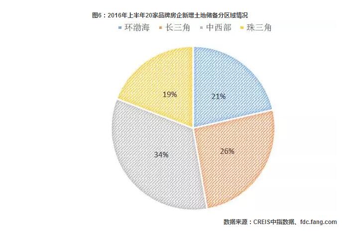 图6:2016年上半年20家品牌房企新增土地储备分区域情况