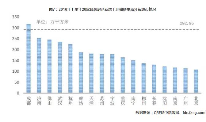 图7:2016年上半年20家品牌房企新增土地储备重点分布城市情况