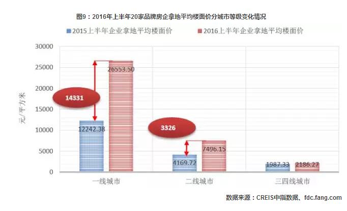 图9:2016年上半年20家品牌房企拿地平均楼面价分城市等级变化情况