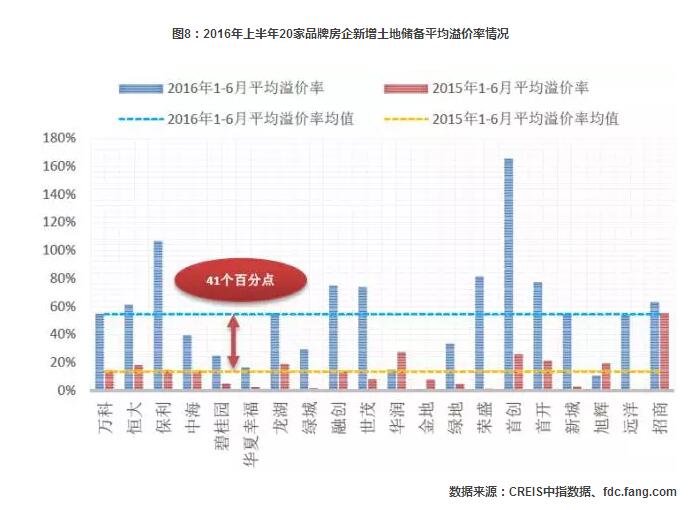 图8:2016年上半年20家品牌房企新增土地储备平均溢价率情况