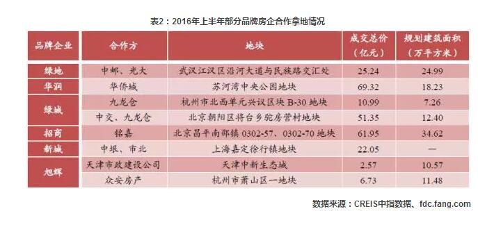 2016年上半年,政策宽松趋稳,各类需求集中释放推动市场整体高位运行,优秀的品牌房企抓住市场机遇加快去库存,实现了销售业绩的快速增长,拿地积极性普遍增加,部分城市单价、总价地王频被刷新。整体来看,品牌房企偏重于在市场风险较小的一线城市、热点二线城市及有发展潜力的三四线城市拿地,并凭借突出的资金、运营优势,展现出了较强的土地资源整合能力。此外,品牌房企在投资决策上加大拿地成本控制,更倾向于借助联合拿地方式增强土地市场竞争力。