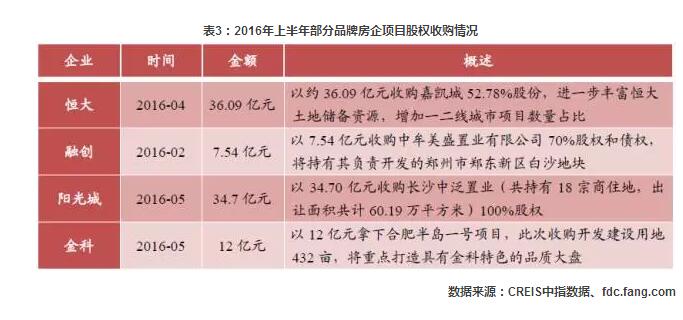 表3:2016年上半年部分品牌房企项目股权收购情况