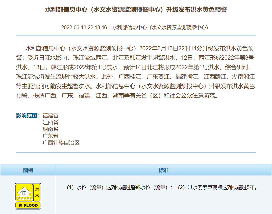 水利部水文情报预报中心网站消息,水利部信息中心(水文水资源监测预报中心)2022年6月13日22时14分升级发布洪水黄色预警:受近日降水影响,珠江流域西江、北江及韩江发生超警洪水,12日,西江形成2022年第3号洪水,13日,韩江形成2022年第1号洪水,预计14日北江将形成2022年第1号洪水,综合研判,珠江流域将发生流域性较大洪水。此外,广西桂江、广东贺江、福建闽江、江西赣江、湖南湘江等主要江河可能发生超警洪水。水利部信息中心(水文水资源监测预报中心)升级发布洪水黄色预警,提请广西、广东、福建、江西、湖南等有关省(区)和社会公众注意防范。