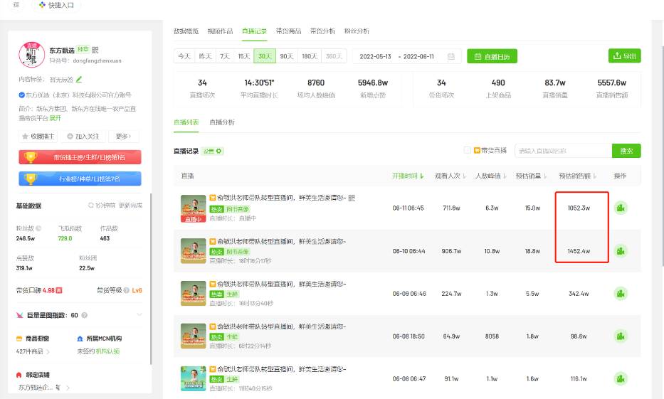 东方甄选的直播统计数据