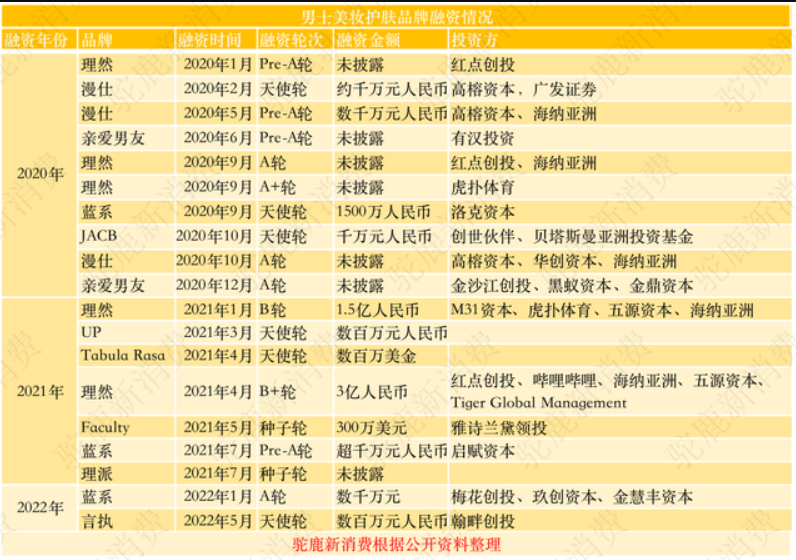 据驼鹿新消费不完全统计,最近三年,国内有超过20个男士美妆护肤品牌宣布获得融资。其中2020年,男士美妆护肤品牌的融资数量十余起,2021年将近10起,其中包含了理然、亲爱男友、UP、蓝系等品牌。