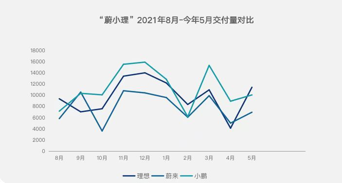 今年4月,蔚来、理想、小鹏汽车交付量都出现大幅下滑,今年5月,理想和小鹏交付量迅速回升,但蔚来交付量仍稍显逊色。今年5月蔚来交付量为7024辆,而理想和小鹏的交付量分别为11496和10125辆。