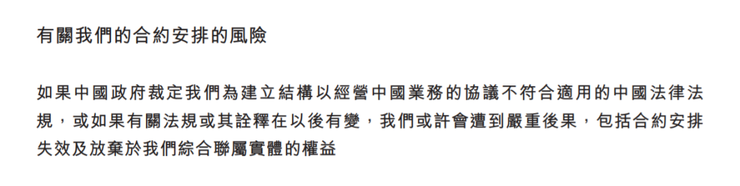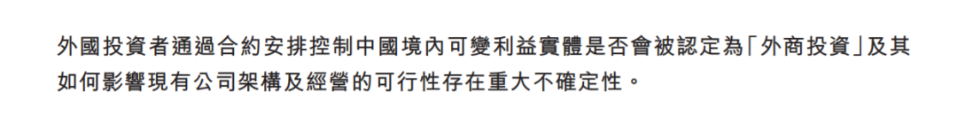此外,其还表示,“外国投资者通过合约安排控制中国境内可变利益实体是否会被认定为「外商投资」及其如何影响现有公司架构及经营的可行性存在重大不确定性。”