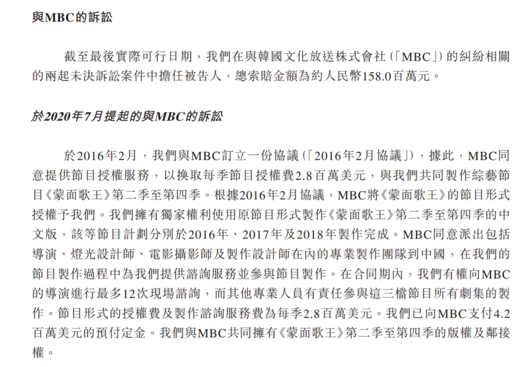 根据最新的招股书,目前星空华文与韩国MBC依然存在纠纷,被索赔金额达到1.58亿元。涉及到的纠纷正是《蒙面歌王》的版权问题。