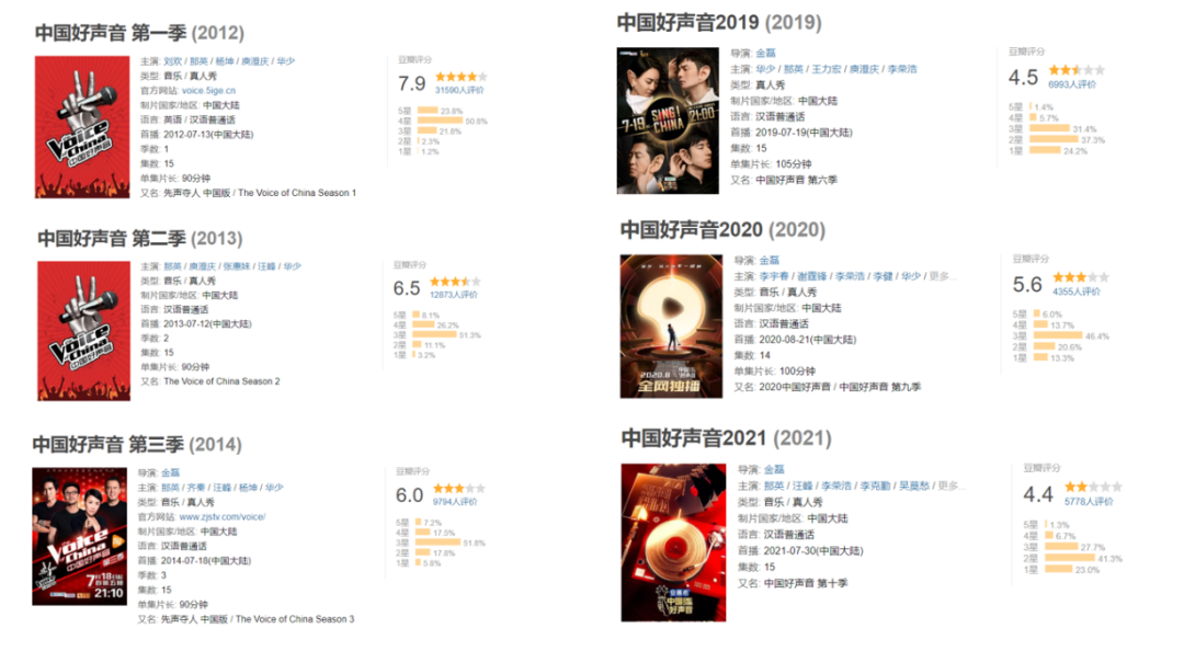作为星空华文旗下最成功的综艺节目,《中国好声音》的收入大幅缩减。从4.91亿元减少到2.52亿元,下滑了48.7%。通过豆瓣评分来看,最近几年无论是人气还是评价,《中国好声音》都已经明显下滑,更像是在苦苦支撑。实际上这是综艺节目的普遍现象,更何况《中国好声音》已经创作了10季。