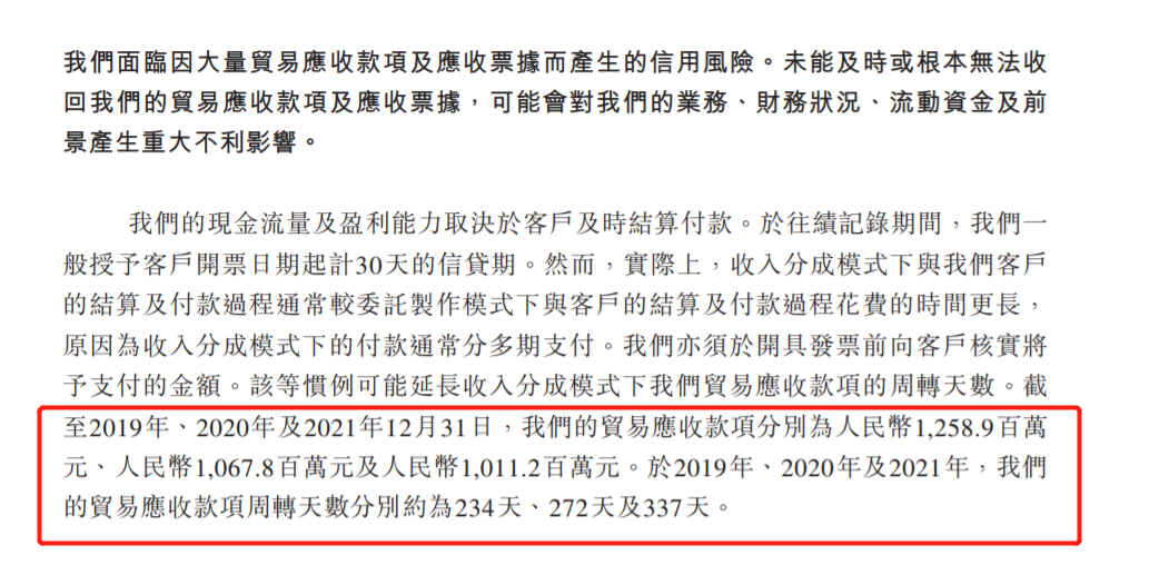 除了商誉减值问题,坏账风险也是悬在星空华文头顶上的剑。根据招股书,截至2019年、2020年及2021年12月31日,星空华文的应收款项分别为12.59亿元、10.68亿元及10.11亿元,应收款项周转天数分别约为234天、272天及337天。应收账款周转天数不断增加、已至337天,说明星空华文收回现金的能力越来越差。在经营不断下滑的状态下,这样的情况无疑更增加了压力。