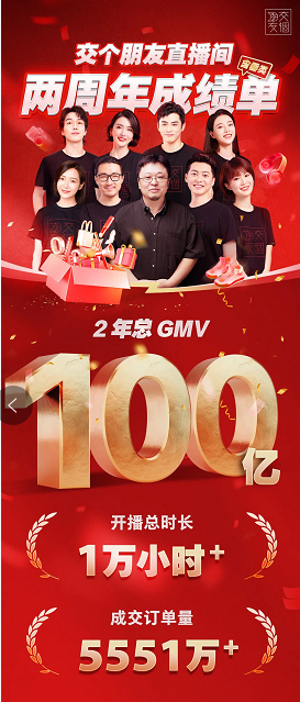 据悉,此前4月11日,交个朋友公众号发布2周年报告,数据显示,过去2年交个朋友总GMV达100亿元,开播总时长达1万小时+;团队方面,交个朋友员工从最初7个人,发展到目前的1400多人;主播团队也从早期3个主播,扩展到目前40人+,开播频率和时长从1周1播,提升到当前的1周7播。并建立起美妆、服饰、运动等各个垂直领域的直播账号矩阵。
