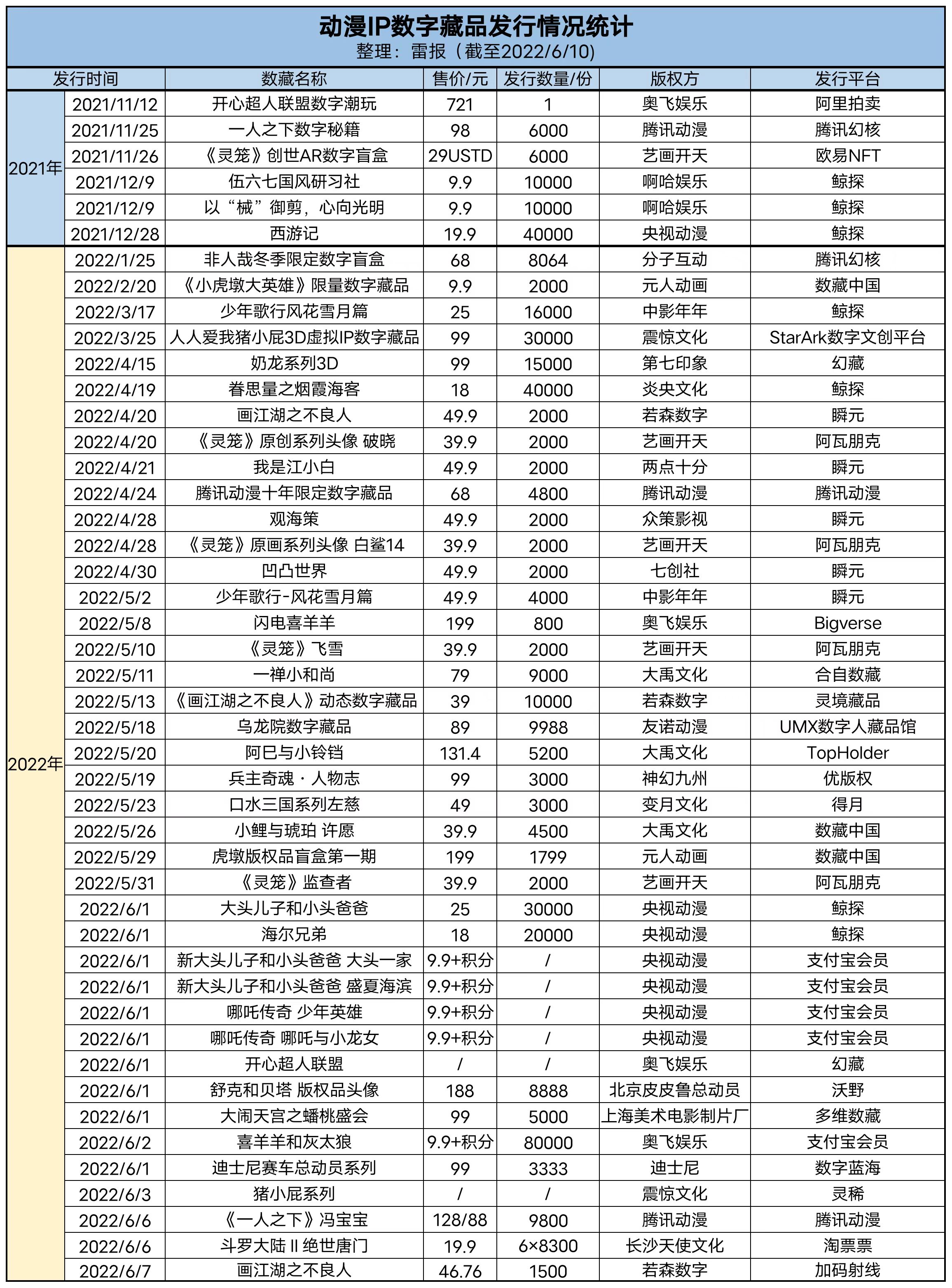 在上周五晚8点的直播分享中,雷报就动漫IP当前在数字藏品领域的发行现状、变现情况和平台选择等内容进行了探讨;同时雷报也采访了七创社、中影年年等发行了数字藏品的动漫公司,对于动漫IP方在数字藏品领域的成绩和未来规划进一步明晰。