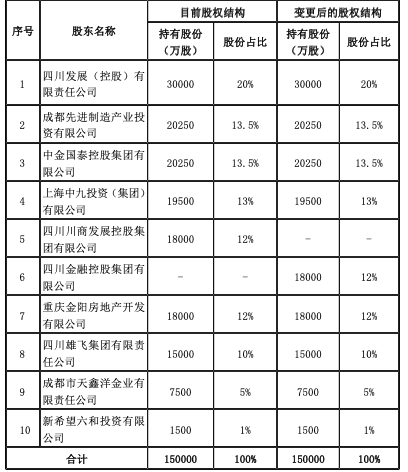 此次股权转让后,四川发展(控股)有限责任公司仍为国宝人寿第一股东,股份占比20%;成都先进制造产业投资有限公司和中金国泰控股集团有限公司股份分别占比13.5%;四川金控与重庆金阳房地产开发有限公司股份占比12%;四川雄飞集团有限责任公司、成都市天鑫洋金业有限责任公司和新希望六和投资有限公司股份占比分别为10%、5%和1%。