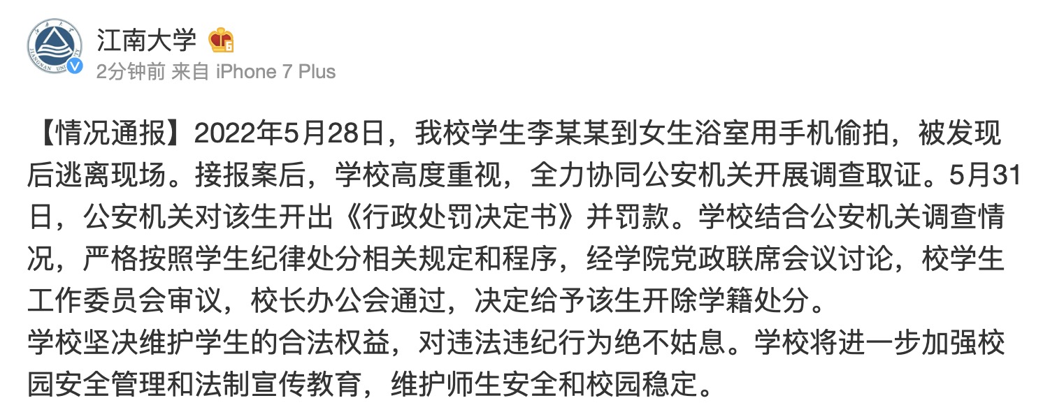 @江南大学 微博14日发布情况通报称,2022年5月28日,我校学生李某某到女生浴室用手机偷拍,被发现后逃离现场。接报案后,学校高度重视,全力协同公安机关开展调查取证。5月31日,公安机关对该生开出《行政处罚决定书》并罚款。学校结合公安机关调查情况,严格按照学生纪律处分相关规定和程序,经学院党政联席会议讨论,校学生工作委员会审议,校长办公会通过,决定给予该生开除学籍处分。