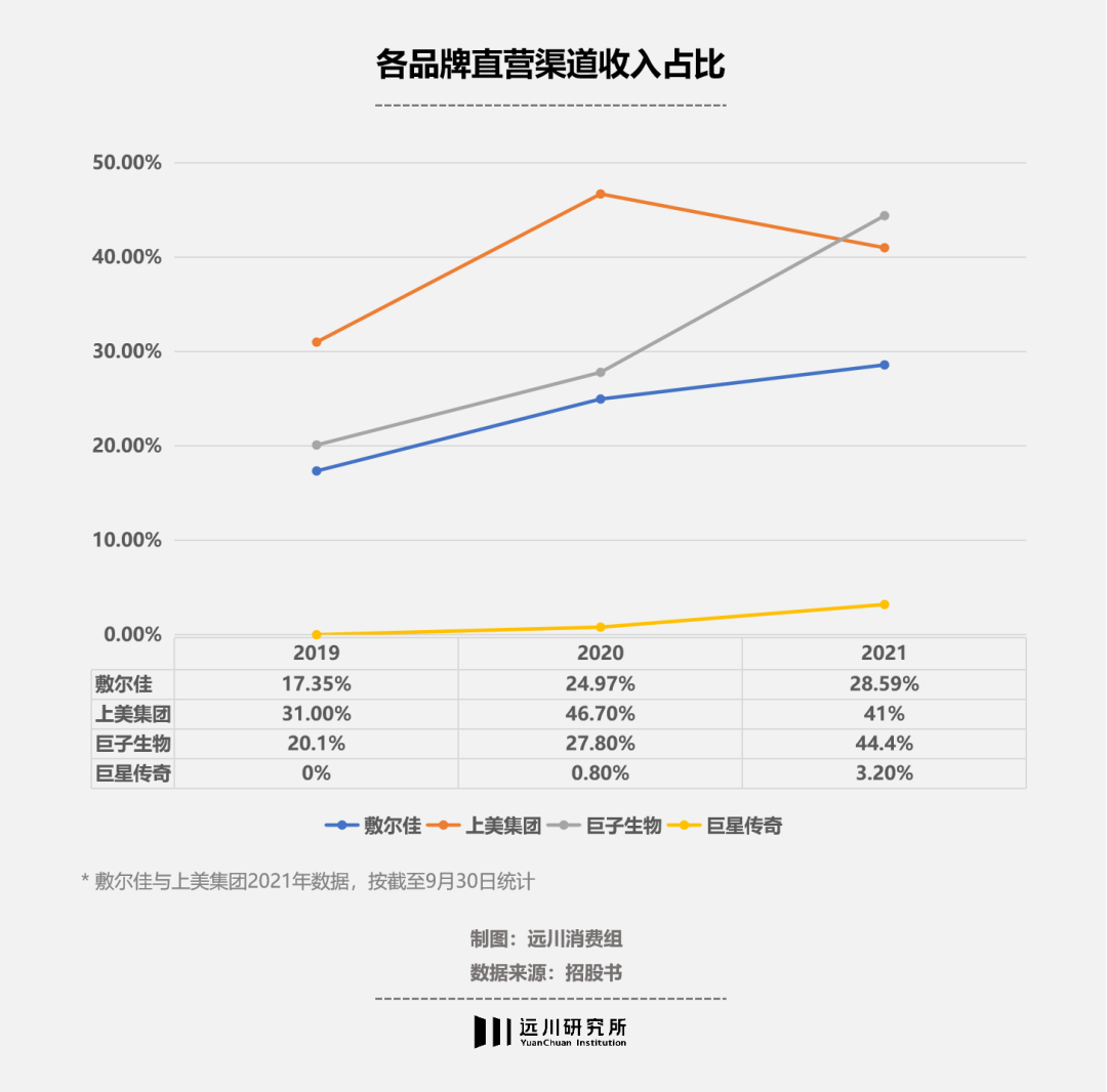 既然代理压货有风险,那就拓展直销渠道,把货直接卖给消费者。以天猫、京东等线上电商旗舰店为新阵地,巨子生物与敷尔佳近几年的直销渠道增长迅速:敷尔佳的线上直销收入3年翻了23倍,巨子生物在2021年靠直销卖了6.89亿,直销营收占比也提升到44.4%。