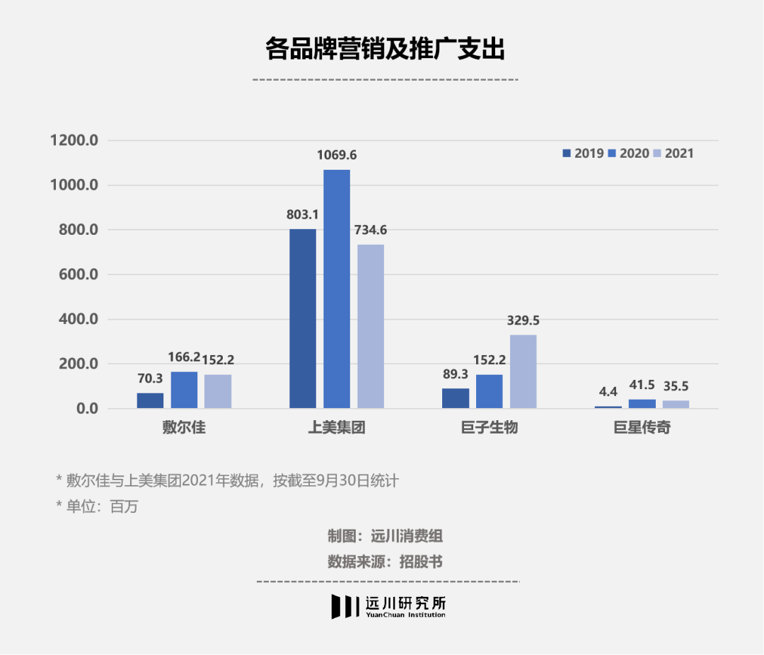 转型的代价反映在各家公司的财务数据上。一方面是经营成本上涨,2018年到2020年,敷尔佳的营销支出增加70倍,巨子生物在2021年的线上营销达到3.06亿,占营收比例接近20%。