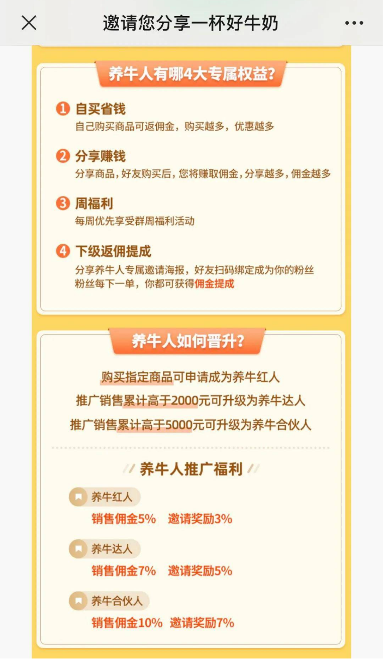 乳业新品牌“认养一头牛”曾推出一种养牛合伙人模式,通过设置邀请奖励和销售佣金,鼓励用户拉人头做下线。凭借社交电商发家,认养一头牛出走半生,归来仍想做微商。
