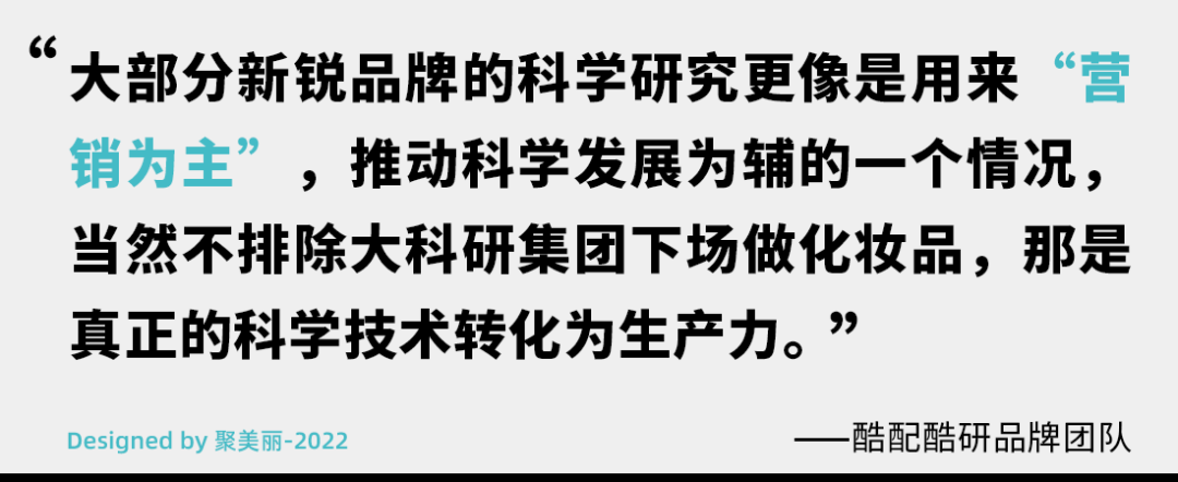 酷配酷研品牌负责人在接受聚美丽记者采访时曾提到:“我国的化妆品科学技术水平,才刚跨过‘从无到有’,即使我们的基础研究人才充裕、资金以及设备都不缺乏,也缺乏经年累月的积累。我们都懂‘师夷长技以制夷’的竞争思路,但通俗来说,我们现在还处于‘师’的阶段。”
