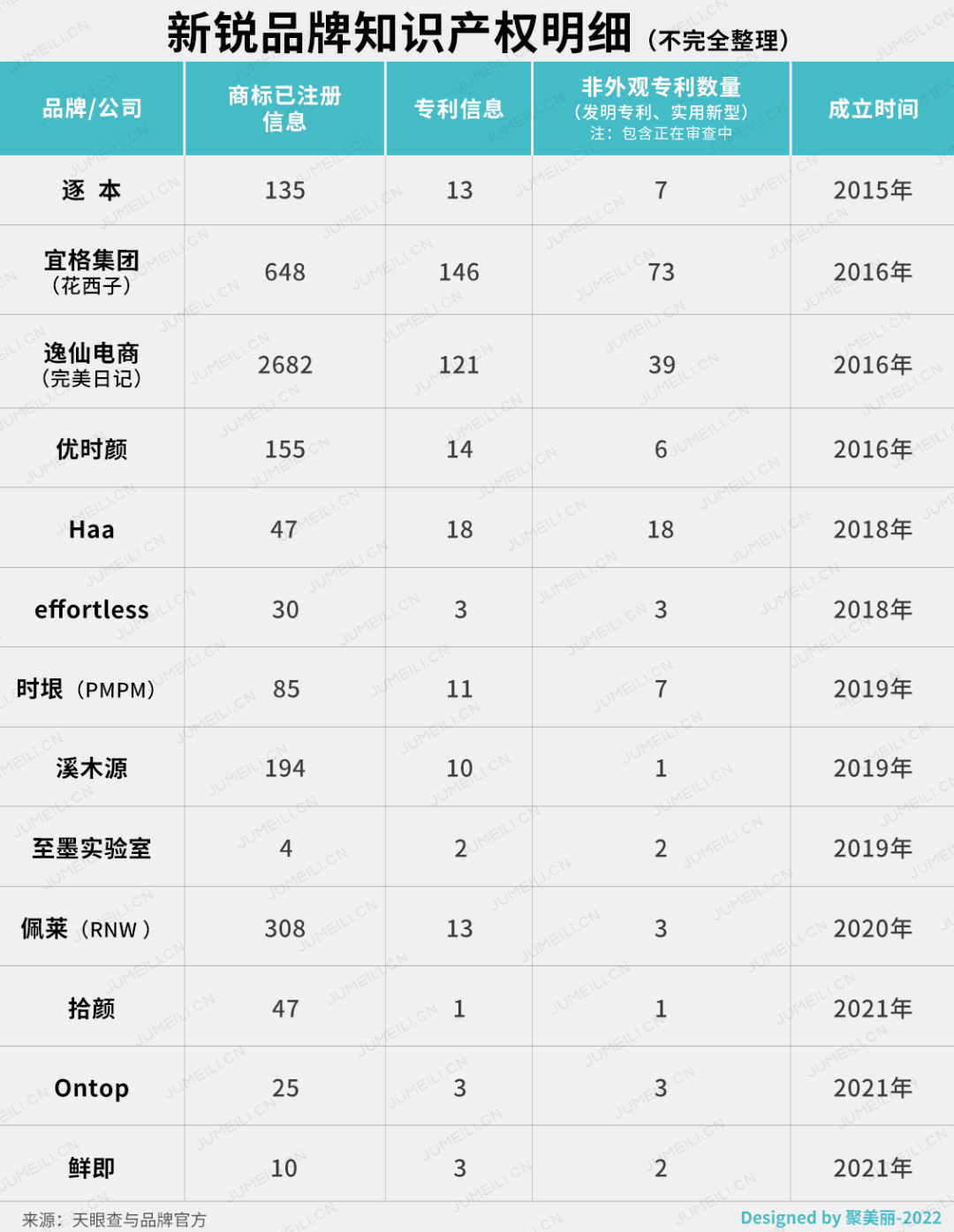 如上图,哪怕是一些2021年才上线的新品牌都已有推出自己的发明专利和实用新型专利。
