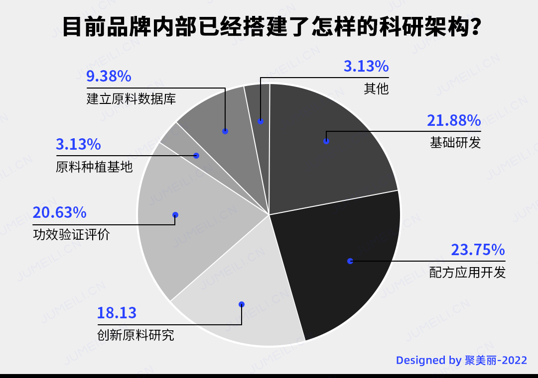 调查数据显示(如下图),在搭建科研架构这个点上,新锐品牌在基础研发、功效验证评价和配方应用开发方面发力的新锐品牌的占比皆超过了20%,而创新原料研究这块占比也接近20%。