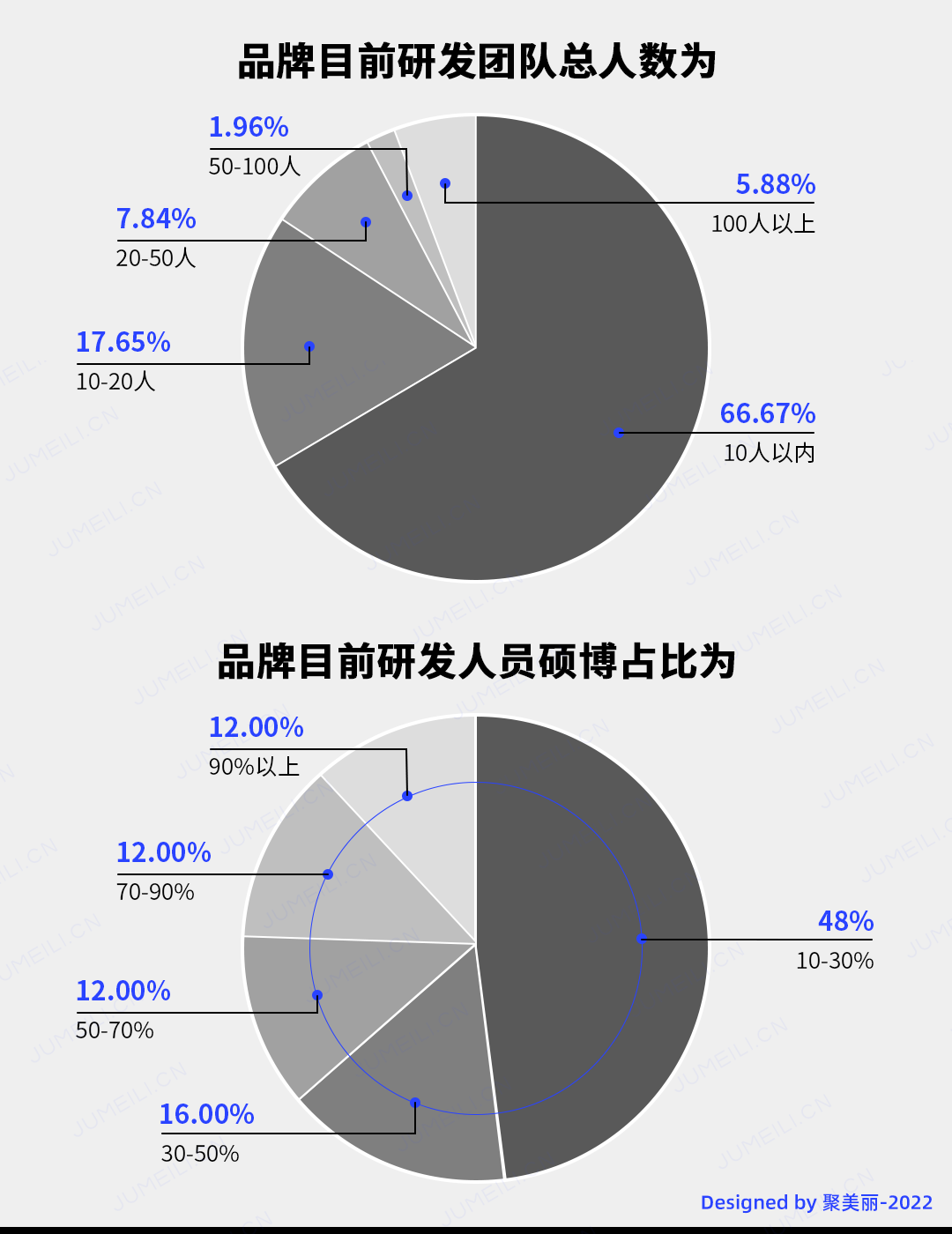 在新锐品牌的研发团队中,研发人员硕博占比在10-30%的品牌约有一半,其他比例的分布较为均匀。其中,研发人员硕博占比在70%以上的品牌也有达到24%。