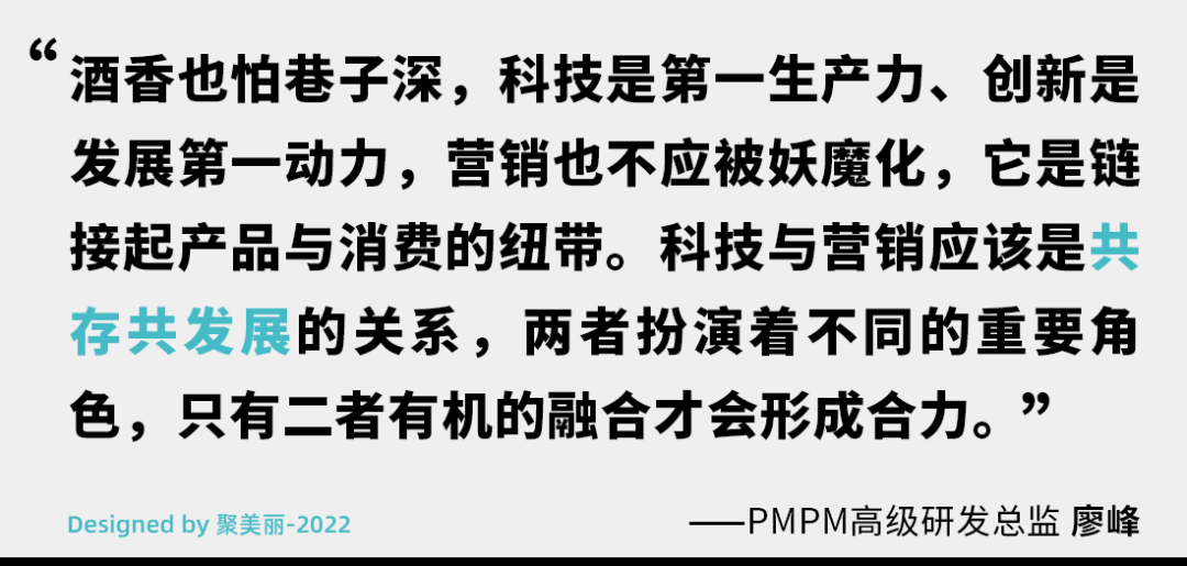 PMPM高级研发总监廖峰博士也发表了自己的看法:“目前很多新锐品牌有着明确的市场定位,会根据产品定位进行科研配置规划,整体思路较为规范,研发工作开展是具有保障的。在这其中,较为有实力的新锐品牌,在研发端进行了深入的规划和持续的投入,在产品创新、原料开发、评估方法标准化等科研实力方面,已经具备完善的业务能力,在个别方面已经具有较为领先的技术实力。”