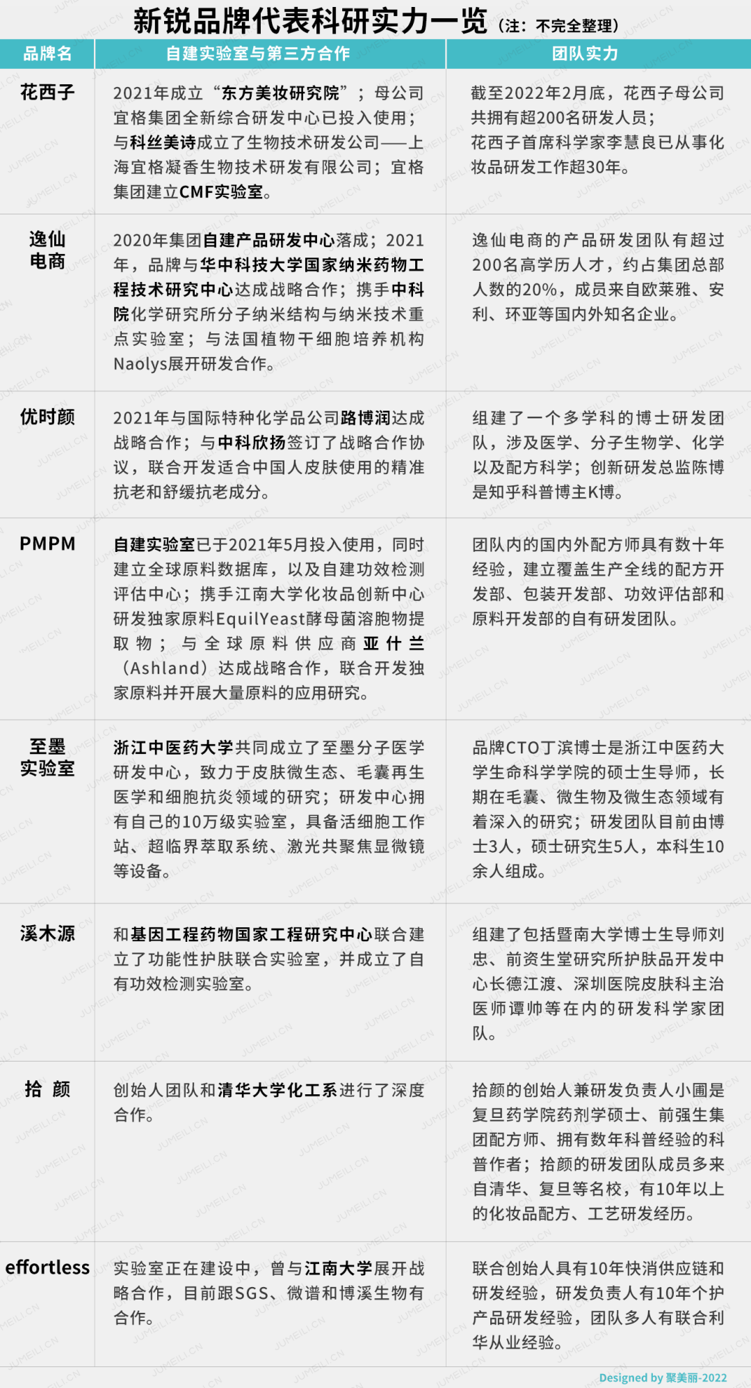 对此,聚美丽整理了一些自建实验室或与第三方机构合作,且团队内有知名研发工程师这类具有丰富经验人士的品牌: