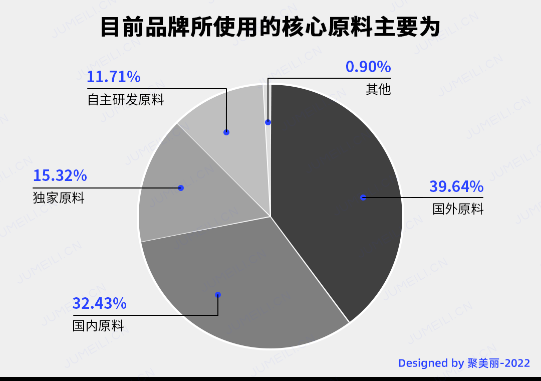 如上图,采用国内原料和国外原料的新锐品牌比重相似,更倾向于国外原料的新锐品牌占比略大。另外,也有一些品牌开始自主研发原料,或者是从原料商手中买断独家原料。