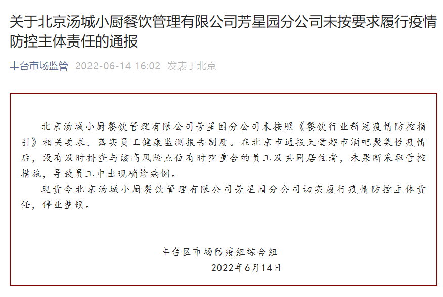 现责令北京汤城小厨餐饮管理有限公司芳星园分公司切实履行疫情防控主体责任,停业整顿。