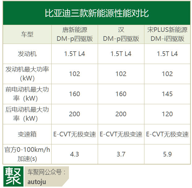 我们来看一下比亚迪最近推出的三款车型,比亚迪在去年9月份,首次推出了宋PLUS DM-i四驱版本,相比普通的DM-i两驱车型,它的最大变化就是加入了一款120kW的后电动机,这样一来0-100km/h加速时间由7.9秒提升到了5.9秒。但比亚迪依然叫它DM-i,毕竟用的发动机和控制系统都是一样的。