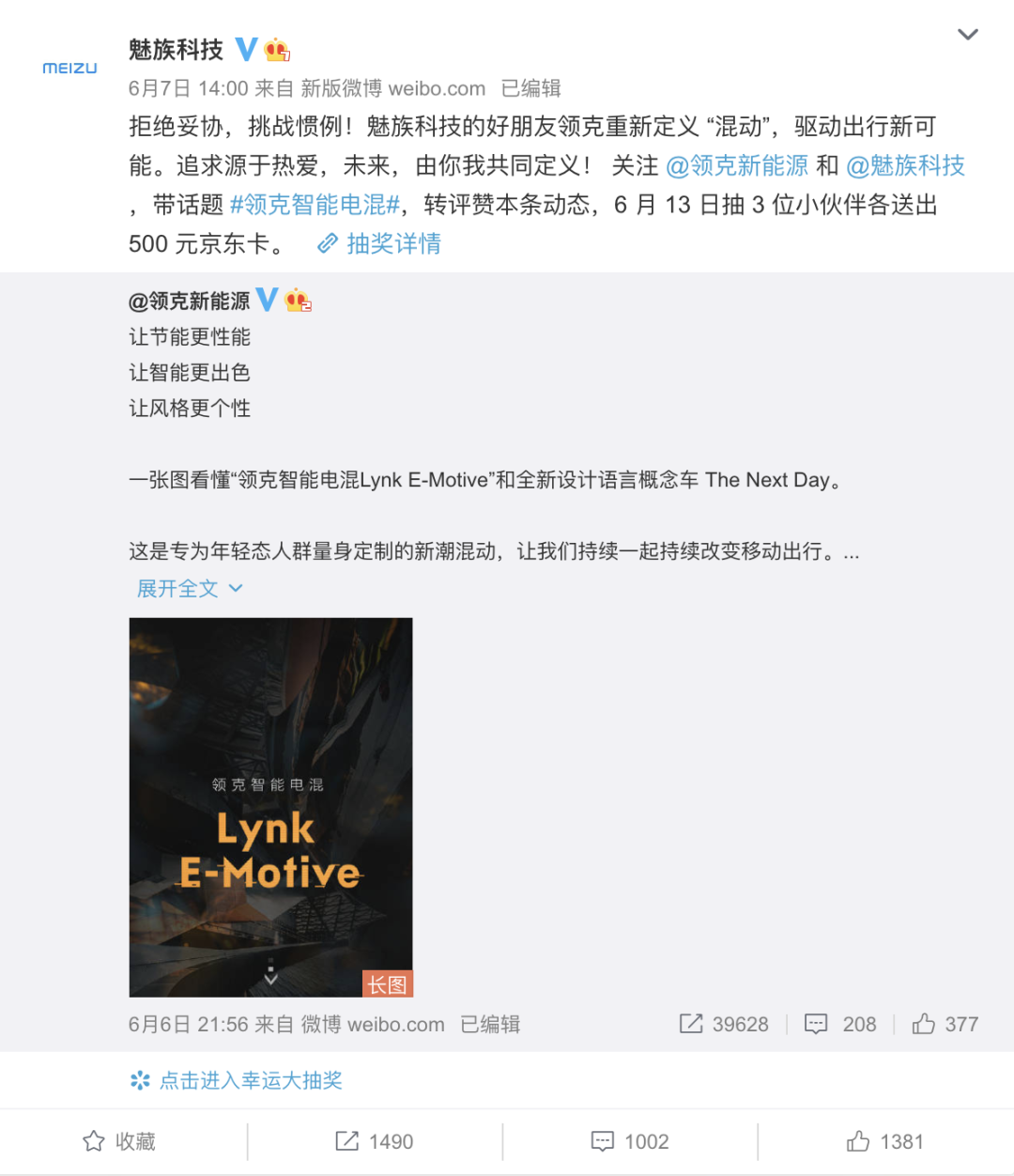 另外一个辅助证据是,6月7日魅族科技转发领克新能源的官方微博,暗示双方将围绕车机系统展开合作。
