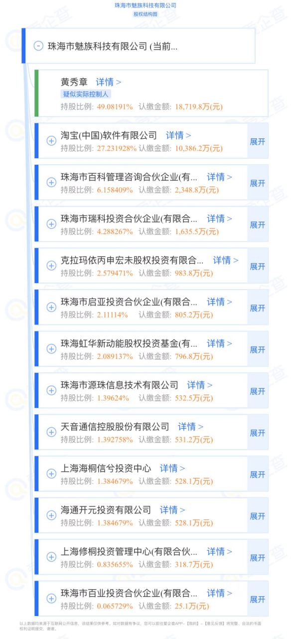 魅族原有股东中黄章仅保留9.79%股份,淘宝中国解套离场,其余股东是否变动并未披露。