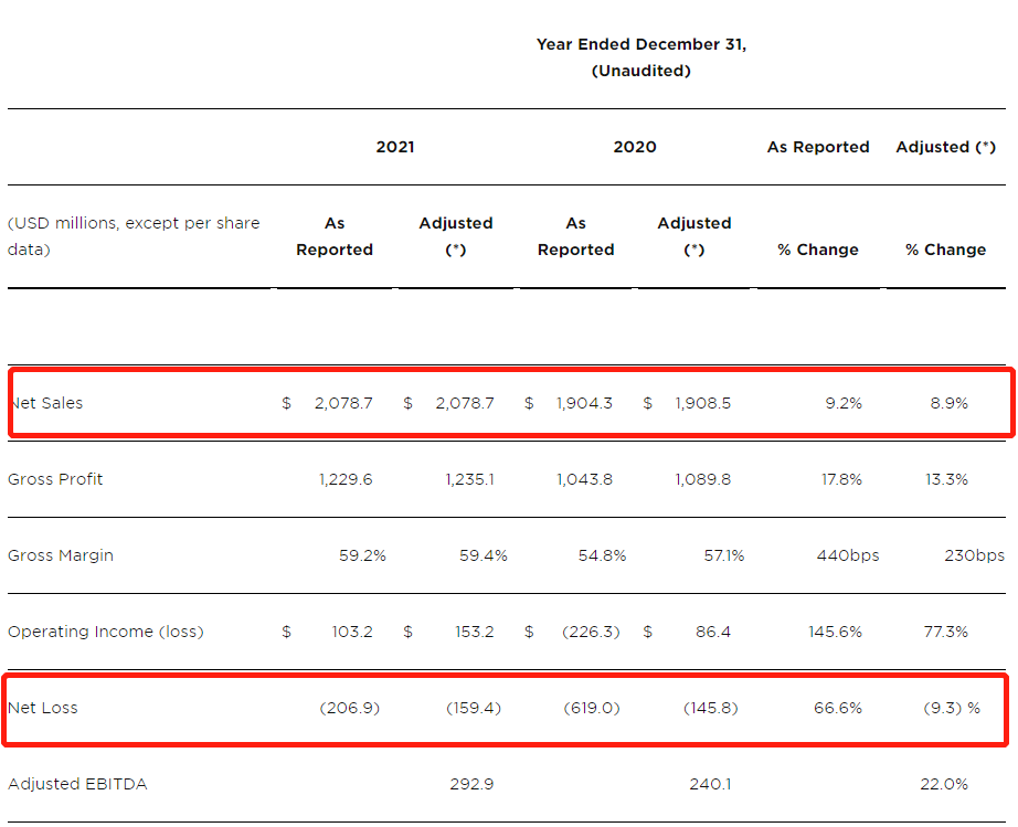仅从财报看,一年过去,露华浓还在亏。2021年露华浓净销售额为20.787亿美元,净亏损约2.07亿美元;而在2020年,露华浓净亏损约6.19亿美元,2019年为1.57亿美元。表面来看亏损虽有收窄迹象,但排除2020年突如其来的疫情影响,露华浓的亏损额相比2019年仍在加剧。