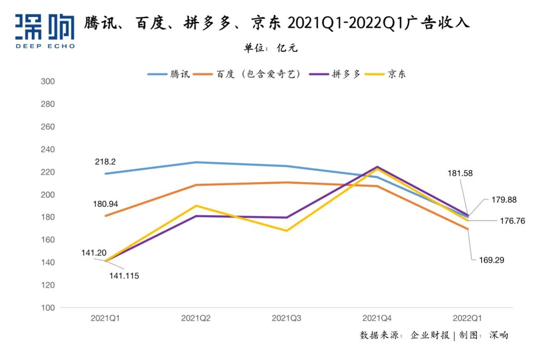 除了拼多多,广告收入超越百度的京东在今年一季度广告收入达到176.76亿元,同比增长25.18%。