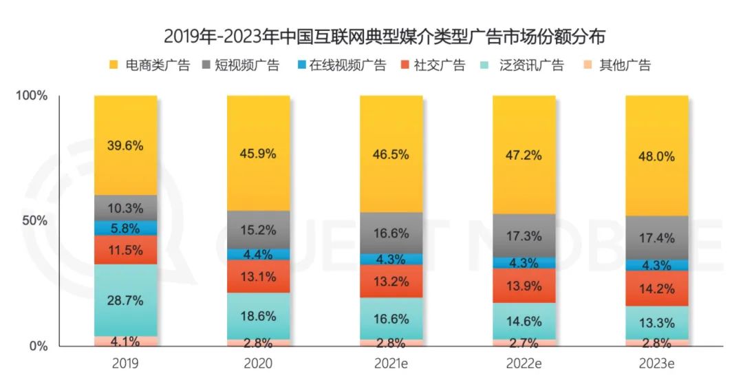 一直以来,电商广告在互联网广告中的市场份额就是最大,并且从Quest Mobile报告来看,近年来其市场占比还在持续增长。产生这一现象的原因在于有电商业务的平台可以实现用户“所见即所得”,看到广告直接跳转产生购买,其转化链路“天然”就更短。最贴近交易,转化效率更高,对商家具有更强的吸引力也就顺理成章。