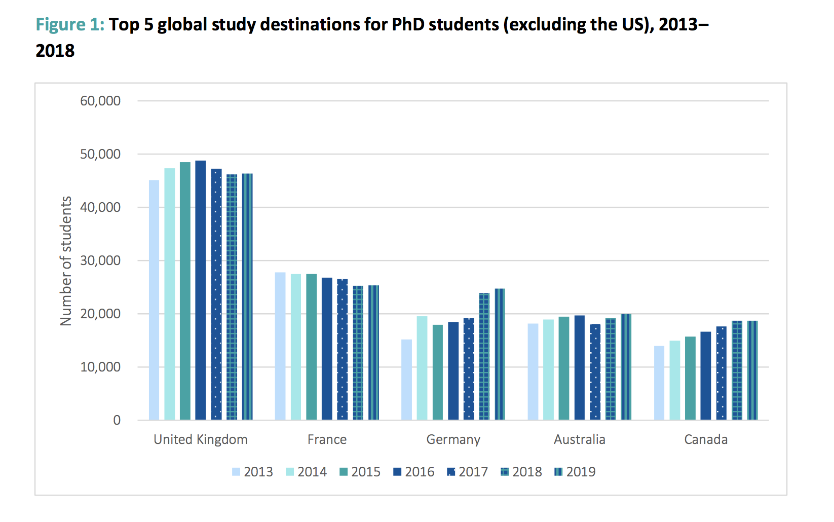 “近年来,对出国读博的国际学生来说,英国的吸引力下降,而德国、澳大利亚和加拿大正在成为新晋宠儿。”