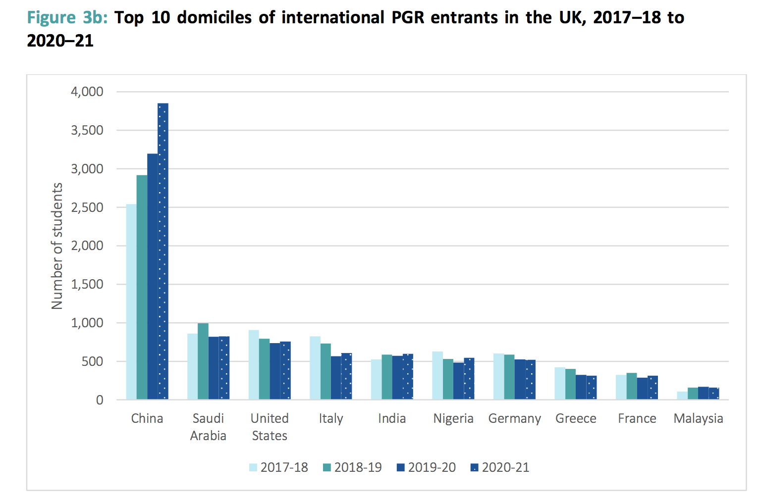 在英读博的国际学生中,中国学生占比最多,尤其在2020/2021学年增速较快,入学人数增长了20.5%,达约3800名学生。