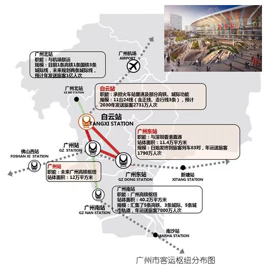 白云站地处白云西北部,南边与广州站距离约5公里,东边与白云新城距离约2公里,项目总投资超过440亿元。