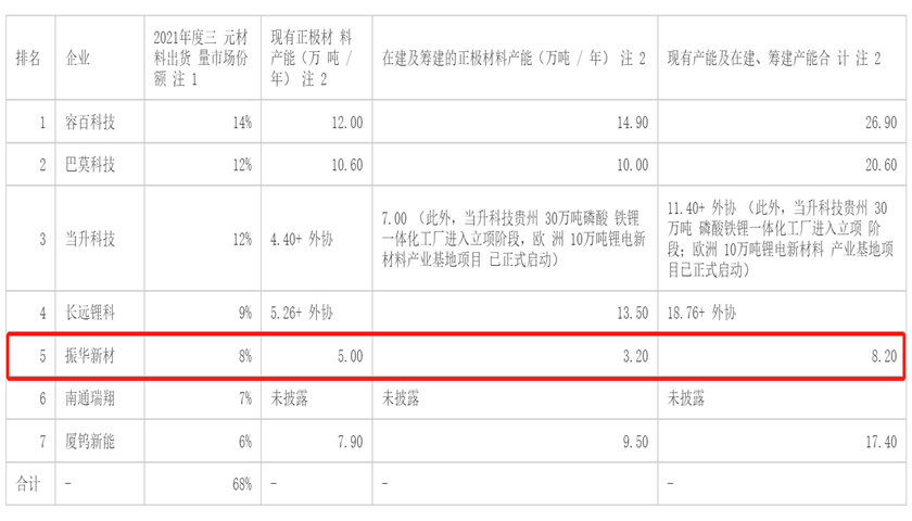 根据振华新材在发行预案中提供的表格粗略计算,上述出货量排名靠前的几家公司已披露累计在建及筹建的正极材料产能已达58.1万吨/年,已披露现有产能及在建及筹建产能合计已超100万吨。