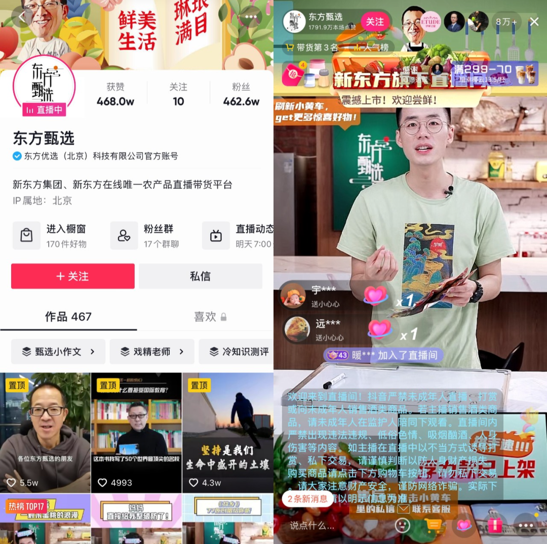 随后,俞敏洪旗下的“东方甄选”制造刷屏盛况,直播间三天涨粉157万,销售额更是增加1777万,更是让新东方在线股价暴涨100%,而主播董宇辉也不断占据社交媒体话题。