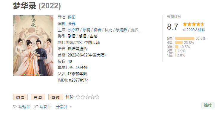 《梦华录》自播出以来,成为每天网络最热门的话题。8天播放超10亿,豆瓣评分为8.7分,甚至超过了《还珠格格》(8.5分)《上错花轿嫁对郎》(8.4分)《步步惊心》(8.4分)等经典剧集,成为兼具播放量与讨论度的高分现象级古偶。
