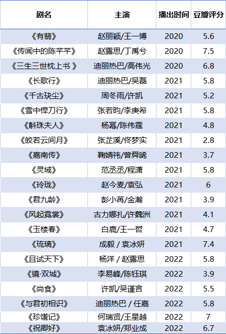 随着“限古令”升级,政策限制下,古装剧全面降温,现实题材电视剧崛起,古偶剧颓势渐显。然而,整体数量的减少,并没有带来质量的增加,没有百花齐放,更没有一枝独秀。近几年,古偶剧豆瓣评分鲜少有上7分的。2020年以来,S+古偶大剧频频失利,进一步暴露出古偶剧“出圈艰难、难出爆款”的问题。