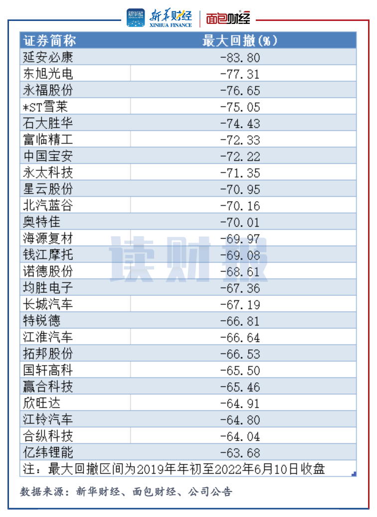 另外,东旭光电、星云股份等10家公司股价的最大回撤超过70%。中科三环、当升科技、宁德时代等22家上市公司股价的最大回撤不足50%。