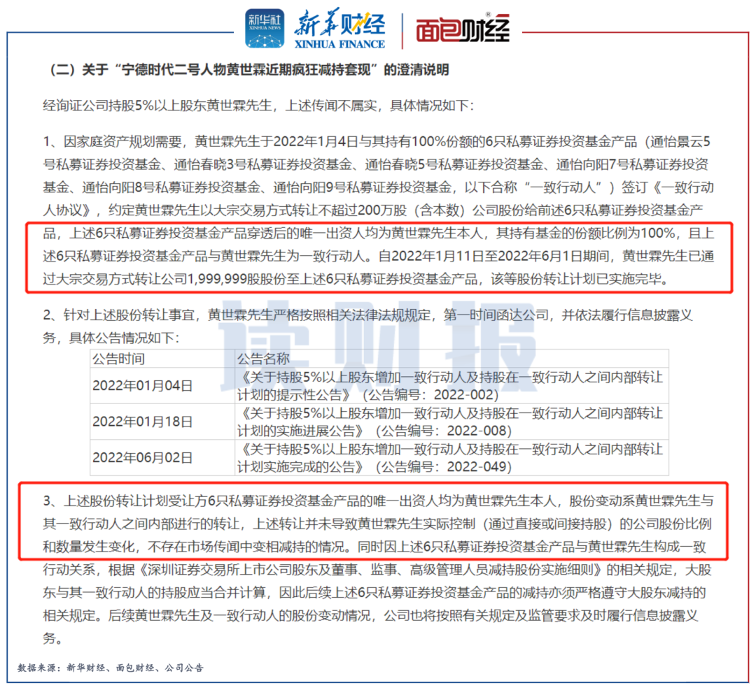 宁德时代称黄世霖的“减持”实质为一致行动人之间内部的股份转让,股份的受让方为该股东持有100%份额的私募基金,“不涉及向市场减持”。