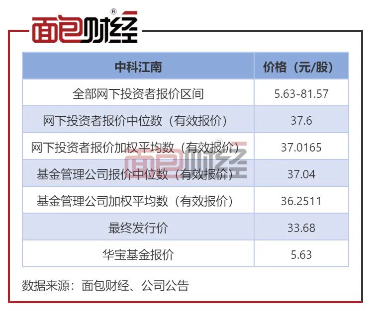 其中,华宝基金旗下38个对象共同报出5.63元/股的价格,在中科江南所有申报价中最低,申报折溢价比仅为0.17倍,被剔除有效报价。