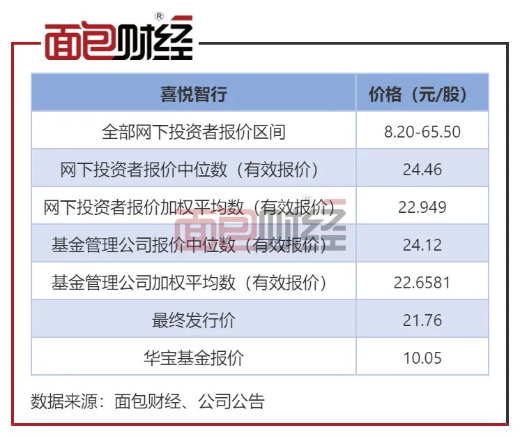 华宝基金对喜悦智行也曾报过偏低申购价。喜悦智行在询价期间共收到418家网下投资者管理的初步询价报价信息,报价区间为8.2 -65.5元/股。在剔除无效、高价报价后,入围网下投资者的报价加权平均数为22.949元/股。