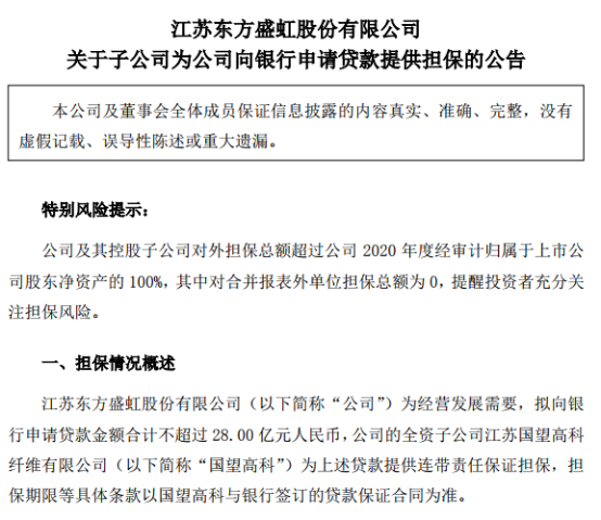 与此同时,东方盛虹自然会不断发布新增借款的相关公告,2022年1月1日,东方盛虹向银行申请贷款金额合计不超过 28.00 亿元人民币,公司的全资子公司江苏国望高科纤维有限公司(以下简称“国望高科”)提供担保。