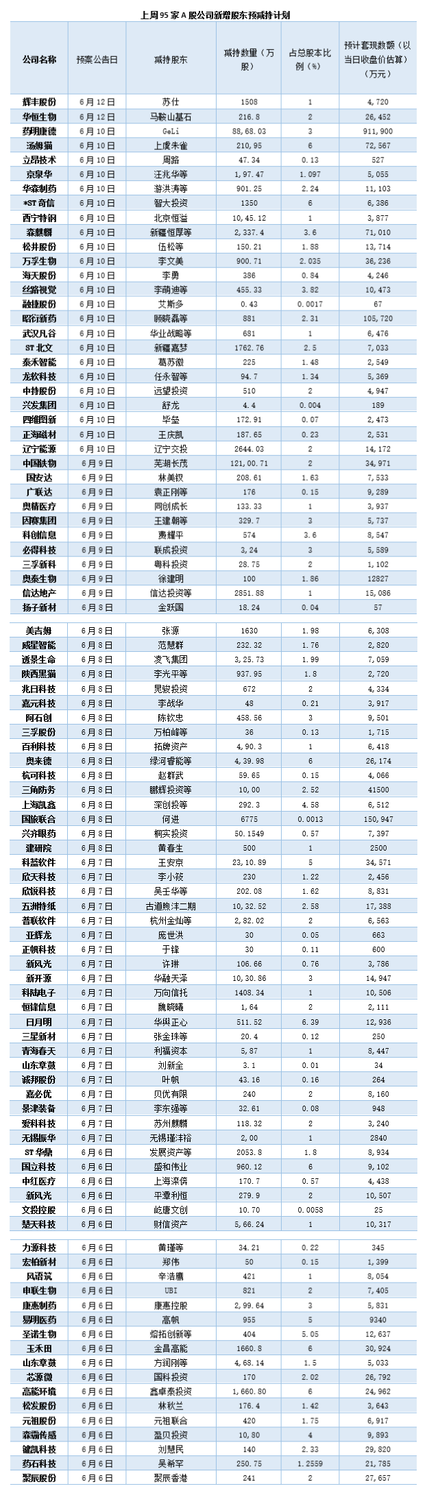 上周(5月30日至6月5日),A股公司预减持规模有所增加。据界面新闻不完全统计,共有95家A股公司披露股东减持计划。